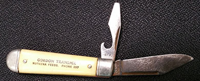 QUESTION: I own two cattle brands that have been in my family for several decades. One is a single letter brand. The other has three letters. Although my family no longer is in the cattle raising business, I have continued to pay the registration fees for the brands in order to retain ownership. When I last visited the Registry office, I was told the single letter brand could sell for as high as $1,800.00. Is this possible? If yes, what recommendations do you have for a possible sale of the brands? – D, Big Timber, MT ANSWER: In the secondary market, especially the antiques and collectibles sector, everything has a price. I will refrain from the plethora of “we only are trying to establish a price” jokes. The “right” cattle brand has secondary market value. Cattle brands are registered on a state by state basis. A cattle brand is private property, making it subject to sale. Since you live in Montana, the market for your brands is Montana. It is unlikely an out-of-state rancher would buy the brands unless he/she has stock in Montana. Single brands and double letter brands are among the oldest “letter” brands. Their legacy makes them attractive. The website www.ranchworldads.com has a URL devoted to cattle and horse brands for sale. [See: http://www.ranchworldads.com/?cat_id=30] Asking prices appear to start at $2,500.00 and can exceed $10,000.00. A family that was in the cattle business for more than 100 years in Colorado and New Mexico is asking $25,000.00 for an “established unique single iron Colorado / New Mexico Brand.” Marc Allard, a Colorado cattle rancher, gave up ranching after 50 years. His brand was “Al” with a line beneath the letters. Allard turned down $1,500.00, feeling the brand was worth between $3,000.00 and $4,000.00. [See: http://www.marketplace.org/2010/08/17/colo-cattle-branding-fetches-big-bucks] The key to selling any item is to find the right marketplace. The Montana Cattlemen’s Association is a good starting point. Seek recommendations from it leadership for the best method to sell your brands, especially the single letter brand. Inform the registry office of your desire to sell. It should be in a position to forward the contact information for potential buyers. Although I was not able to locate auction records for the sale of cattle brands, such auction sales must occur. The Montana Cattlemen’s Association or the registry office should be able to put you into contact with two or three major cattle auction firms who have sold brands. Of course, the website mentioned earlier also is a possibility. With the exception of the auction route, you need to determine an asking price before attempting to sell your brands. The single letter brand has the most value potential. $4,000.00 should sell it quickly. $6,000.00 should eventually sell it. Asking $7,500.00 or more may mean you will own the brands until it is your time to go on the last great roundup. The three-letter brand will be much more difficult to sell. You need to find a buyer with the same three initials. Based on my findings, a top price between $1,000.00 and $1,500.00 appears reasonable. The above does not take into consideration the potential historical value of these brands. If they played a significant role in cattle raising in Montana, their potential value increases 15 to 30 percent. QUESTION: I recently found a two-blade (cutting blade and a can opener/screw driver bade) pocket knife. The advertisement on the white handle reads “GORDON TRANSFER / NUTRENA FEEDS. PHONE 297.” The pocket knife measures five-inches from the end of the handle to the tip of the blade. The blade is marked: “Colonial / Prov. / USA.” What is it worth? – MH, Bowie, TX, Email-Question