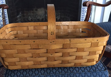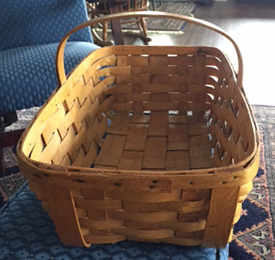 ANSWER: The good news is that I have no problem being the bad guy. The bad news is your laundry basket falls into the same phrase the Three Little Pigs used when answering the Big Bad Wolf – “not by the hair of my chinny chin chin.” One look at the construction of your laundry basket in the photographs that accompanied your email was sufficient evidence to assign a non-Shaker origin. The Shakers were pattern driven, that is to say, they made products that conformed to narrow design parameters. Although there were slight differences between the same products made at different Shaker communities, the overall design was basic. Shaker laundry baskets had side handles and not an inverted “C” shaped central handle. The weave on the sides were very tight, often so dense no light could pass through. The shape was more chest-like than basket-like. The bottom of the basket was treated differently.