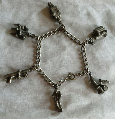 The $30.00 price was a warning signal. “Beware of bargains” is one of the basic rules of authenticating. A period Shaker laundry basket in very good or better condition sells in excess of $500.00. The aging and wear on your basked is not consistent with an older basket. The wood looks new. It does not have the patina that comes over time from exposure to the dirt and chemicals in the air. If you push the horizontal body splats up and down, you will see little discoloration. Although I have not handled the basket, the handle most likely does not exhibit the underside smoothness that would occur as the basket was picked up, carried, and put down through years of use. I have little respect for the “woulda, coulda, shoulda” sellers. Antiques and collectibles buyers on the whole are gullible. They accept what sellers tell them, primarily if the story is an especially good one. Survival in the antiques and collectibles game requires a constant questioning mentality. Whenever anyone, dealer or expert, tells you something, your first reaction should be to ask the person to show you the proof to back up the claim. QUESTION: I recently acquired a charm bracelet with a Depression era theme. There are six silver-plated charms of Depression era workers – a man standing on a box marked “SOAP,” a worker pushing an old fashioned street sweeper, a worker pushing a wheelbarrow, a man on a bench with a round jug, a man leaning on a lamppost, and an unemployed man with a sandwich board marked “Joe the Hatter.” The charms are on a curb pattern chain bracelet. An expert suggested it was made and sold by working families to help the unemployed. I would appreciate any information you can provide about the bracelet. – DG, Nashua, NH, Email Question