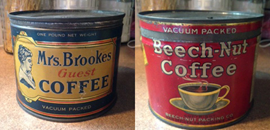 QUESTION: I recently purchased a lot of two antique coffee cans for $60.00. The first is for Mrs. Brookes Grind Coffee. The second is for Beech-Nut Coffee. Both cans are in very good condition. When I returned home, I did some research. I was surprised to find a 2011 value of $385.00 for the Mrs. Brookes can on the Kovel website. Is this still a valid price in 2016? What is your take on my purchases? – LH, State College, PA, Email Question