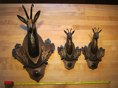 ANSWER: Beech-Nut Packing Company, now Beech-Nut Corporation, was founded in 1891 and located in Canajohaire, New York. Beech-Nut is credited for patenting the first vacuum jar. Eventually, the technology was applied to vacuum packed cans. Beech-Nut produced a wide variety of packaged goods including baby food, chewing gum, fruit drops, peanut butter, and pork and beans. In 2009, a new factory, located 20 miles outside Canajohaire, opened. Preferring to date conservatively, your Beech-Nut coffee tin is from the late 1940s or 1950s. The coffee-cup image on your Beech-Nut can is uncommon. Most cans have an oval Beech-Nut Roasted Coffee logo beneath the wording. These common tins sell in the $10.00 to $15.00 range. WorthPoint.com lists an example of your coffee-cup image can that sold on eBay on March 28, 2016 for $41.00. A similar example sold on eBay on April 18, 2012 for $35.00. Although the imagery on your Mrs. Brookes Guest Coffee tin suggests an earlier origin, I date it from the same period – late 1940s or 1950s. Mrs. Brookes remains a mystery. With the exception of the 2011 listing in the Kovels’ price guide, I found no other information about the brand or manufacturer. I am reluctant to accept single price information. The circumstances that led a dealer to ask that price or two competitors to bid the can up to that price are unknown. Further, finding a buyer willing to pay anywhere near the $385.00 price will require a great deal of effort. When analyzing the value of items purchased as a lot, your two coffee tins demonstrate that splitting the cost and assigning an equal value to both objects makes no sense. Clearly, the Mrs. Brookes Guest Coffee tin is worth more than the Beech-Nut Coffee tin. Fred Dodge’s “Antique Tins Identification & Values” Book 1 and Book 2 (1998), published by Collector Books, are the primary identification research sources for advertising tins. They were published at the height of the coffee, tobacco, and tin packaging collecting craze. Eighteen years have passed without an update, a clear indication the secondary market has fallen on hard times, especially for common and harder-to-find examples. There are advanced collectors, antiques in their own right, who spend top dollar to acquire upper echelon and masterpiece units. With the generation who remembers buying coffee in tins dying, long-term financial prospects are questionable. Since you collect coffee tins, you did well. Sixty dollars for the two is a bargain. Be as astute with your buying dollars in the future. QUESTION: In the late 1940s, my father bought seven Mettlach steins, one holding three liters and six holding one liter, from a local antiques dealer. The large three-liter stein stands 17 1/2 inches high and has a base diameter of 8 inches. It is marked on the bottom “2194.” The lid features a relief turtle. The body contains a top and bottom band with a poem. One verse reads: “IM SCHWARZEN WALFISH ZU ASCALON, WIRD KEIN PROPHET GEEHRT, UND WER VERGNÜGT DORT LIEBEN WILL, ZAHLT BAAR, WAS ER VERZEHRT.” The main portion of the body contains a Wedgewood jasper-like panel featuring three mural scenes of elves and a drinking motif, each scene separated by columns. The handle is in the shape of an alligator. What is the value of my stein? – WH, Zelienople, PA, Letter ANSWER: Your Mettlach stein #2194 is known as The Black Whale at Ascalon stein among collectors. The verses are from a popular German universities beer drinking song entitled “Im schwarzen Walfish zu Askalon.” Although the melody is old, Joseph Victor von Schefell created the lyrics in 1854. The song celebrates the Bacchanalian life. When presented a bar bill after three days of drinking, a student of the classics claims to have left his money at home. The bartender throws the student and his friends out into the street. The students leave singing a song lamenting the fact that a prophet has no honor in his own country. The song has multiple verses, including political commentaries and mocking insults of Heidelberg fraternities. The story has lent its name to numerous German inns and restaurants including establishments in Heidelberg and Bad Säckingen. The basic story verses are found on your Mettlach stein. The translation for the verse you provided is: “In the Black Whale at Ascalon; No prophet hath renown; And he who there would drink in peace; Must pay the money down.” [See: https://en.wikipedia.org/wiki/Im_schwarzen_Walfisch_zu_Askalon] I found two sell through records for your Mettlach #2194 stein. Several websites including www.liveauctioneers.com reported Burchard Galleries, Inc., of Florida sold an example for $375.00. The bidding started at $250.00. WorthPoint.com lists an example that sold for $355.00 on eBay on June 18, 2010. I did find a sell through listing on eBay.ca, Canadian eBay, for $624.99. I was not able to determine the date of the sale. I also found a stein dealer who was asking $600.00 for an example with the lid missing. While tempted to accept the $624.99 as an indication of increased market interest, it is most likely an anomaly. Mettlach steins, especially in the American marketplace, were one of the many collecting categories impacted financially by the 2008-2009 Great Recession. In addition, the stein collector base is aging. Young collectors, even in Europe, are not replacing older collectors. Having lived through the Golden Age of Mettlach stein collecting (1980s and 1990s), it is sad to witness the financial decline. A realistic value for your stein is $400.00 to $450.00. A specialized stein dealer will ask more, but he/she has developed the clientele to pay it. QUESTION: Some years ago, I received three Austrian trophy chamois mounts from a friend. The base of each is a wooden oak leaf plaque with a shield drop. Mounted on each is a carved wooden head of a chamois with antlers attached to it. Normally such plaques have a portion of the skull with the antlers. The largest ex
