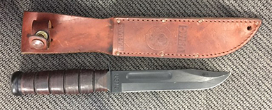 Chances of you owning one of the “initial” four finials is zero. What you own is one of the mass-production examples of the 1923 Otto Gahr design. The stock photo website www.alamy.com offers numerous images of this flagpole finial. The eagle is gold gilded as are the bands around the silvered wreath. There were many variations of this flagpole finial and its eagle. “Deutschland Erwache” by Ulric of England and Otto Spronk, published by R. James Bender Publishing in May 1997, pictures several of them. Although the survival rate may be small, there are examples available in fine or better condition. Admittedly, some may be restored. The secondary market is fluid. I did find examples in fine condition listed for over $10,000.00. Each was in C8 or better grade condition. Once a seller is aware of high numbers, it is hard to imagine his/her example is worth less. There were no records for C3 to C5 examples, most likely because there is little to no market for them. Condition is critical to value. At best, your example is in restorable condition, meaning it has to be sand blasted, re-silvered, and re-gilded. Collectors will not accept amateur restoration. Restoration has to be done by a professional. Selling German National Socialist material is problematic. Many selling sources such as eBay prohibit listing “Nazi” material. There are more than a dozen specialized internet sellers, such as www.oakleafmilitaria.com, you might consider approaching. Some gun websites allow the sale of material. You will achieve the best price if you can find an auction source. If you do opt for the auction route, make certain the auctioneer reaches an international market and takes online bids. The strongest market for the Deutschland Erwache flagpole finial is Germany. If the person who told you it was worth over $10,000.00 was serious, ask him to “put the money where his mouth is.” Offer it to him for $5,500.00. If he accepts, sell. You have the money. He has the problem of what to do next. What is my estimate of the flagpole finial’s secondary market value? Given its condition and my conservative approach to value, its secondary market value is between $1,250.00 and $1,750.00. Please email me and let me know how you disposed of the Deutschland Erwache flagpole finial and what price you did achieve. QUESTION: I have a KA-BAR Marine issue military fighting knife in its leather sheath. It is in very good condition. What is it worth? – KT, Email Question