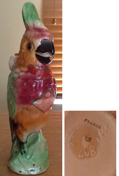 The key to a do it yourself approach is the condition of the tabs that hold the glass panels in place on the shade. If the tabs are still viable, move forward. If not, you need to find someone to replace them. This is a tricky procedure. The shade frame is made of a white/slush metal. It melts easily, meaning a standard home soldering iron is not acceptable. The cost of restoration often exceeds the final value of an object is an antiques and collectibles axiom. I have lost count of the number of times I have spent more to conserve, an approach I prefer over restoration, an object than the resulting value once the conservation was complete. I never regretted the money I spent, believing I left the campsite (in this case, the object) in better shape than I found it. Antiques and collectibles restorers are not licensed nor trained is a truism. Some are excellent, having spent decades honing their skills. Others are butchers, ruining objects rather than saving them. Before trusting your lamp to anyone, check their qualifications. Insist on seeing some of their finished work. Ask for references. The secondary market value for your lamp, cleaned up and with the light fixture and cord updated is between $500.00 and $600.00. The cost to have a skilled professional do the work, could easily exceed this number. QUESTION: I have a ceramic figural parrot liquor bottle that probably dates from the 1940s. It stands 12 1/2 inches high. The label reads: “P. GARNIER, Enghien (indistinct) & FILS PARIS.” It held apricot brandy. The bottom has what appears to be “K “with a “C” superimposed over it and the number “897.” Please tell me its value. – GS, Westfield, New Jersey, Email Question