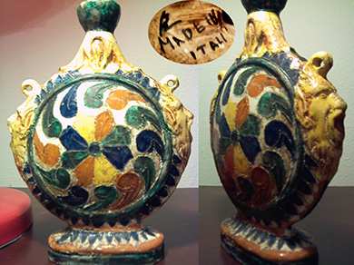 QUESTION: I have an odd pottery vessel, obviously one of a kind, that appears to be very old. It has an oval base, a flat disk body with a sculptured head with pointed ears and its tongue exposed on each side, and an extended cylinder neck. The heads are scary looking. The vessel measures 7-inches from nose to nose. The bottom of the base is marked “MADE IN / ITALY.” Can you help me out on this one? – DP, Higgins, TX, Email