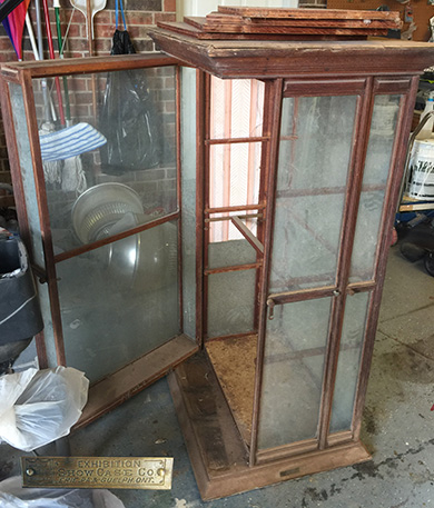 ANSWER: When any manufacturing company ceases operations because of financial problems and is unable to reorganize, its production dies and molds are part of the company’s liquidation. Since the end of the nineteenth century, glass companies have purchased molds from their less fortunate counterparts. The new owners reissued popular patterns or made subtle changes to the mold to create a new pattern. Heisey Glass of Newark, Ohio, was the initial owner of the elephant paperweight mold. When Heisey ceased operations in 1957, Imperial Glass purchased its molds. It added its “I” imposed over the “G” mark to the elephant mold. Lenox Glass Corporation purchased Imperial Glass in 1973. It altered the Imperial mold marks by adding an “L” whose base extended into the “I” / “G” logo. In 1981, Arthur Lorch bought Imperial from Lenox. He added an “A” to the left of the “L.” Lorch’s ownership lasted less than year. Consolidated Colony purchased Imperial in December 1984. The Heisey Glass molds are scattered The Heisey Collectors of America (HCA), established in 1971 and operators of the National Heisey Glass Museum in Newark, Ohio, have acquired a large number of Heisey molds. Th HCA authorizes reissues in non-period colors to raise funds. I am unaware of the current location of the Heisey elephant mold. Maker origin does make a difference in price. Period Heisey examples command the highest amount. QUESTION: I have a display cabinet that I found in a shed. It belonged to my husband’s grandmother. The family believes it came from a dry goods store in Henrietta, TX. A brass plaque on the bottom reads: “EXHIBITION / SHOW CASE CO. / ERIE, PA & GUELPH. ONT.” The case is about 30-inches square and stands about 60-inches high. The two side doors open out. The bottom has six rows containing 10 round indents each. My husband’s grandmother added shelves, which we removed. Based on my research, it appears to have been a showcase for umbrellas. Maybe you could tell us a little more about the cabinet. – PD, Bowie, TX, Email Question
