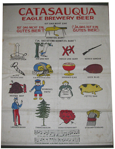 ANSWER: You are close but receive no cigar. Your display cabinet was used to display canes and walking sticks. Although I found listings for other store display cases made by the Exhibition Show Case Company of Erie, I did not find a listing for a cane/walking stick case. Nor could I find detailed information about the company. The Exhibition Show Case Company appears to have made a variety of large standing country/department store display cases. In 2015, a ribbon cabinet sold for $700.00. According to icollector.com, a smaller Henrich’s Exhibition Cane Show Case sold in 2007 for $1,000.00. Adding “Henrich’s” to my search string produced no additional information. The Pehl Trading Ltd. website contains a picture of a cane/walking stick display case that is similar to the one you own. See: http://pehltrading.com/store/store-displays/antique-walnut-walking-stick-cane-cabinet-display-case/. If you choose to restore your cabinet, this picture shows the square lattice section that held the canes /walking sticks in the center of the case and on each of the doors. Your husband’s grandmother must have removed them when she added the shelves. As it stands, your case is in unrestored condition. If you sell it as is, its secondary market value is around $100.00. Professionally restored, its value will increase six to eight times. An amateur restoration would prove financially disastrous. QUESTION: My grandparents and then my uncle owned the Vera Cruz [PA] Tavern from the mid-1920s to the mid-1970s. According to my grandparents and mother, the extended family would gather there and sing German songs. A cloth banner provided by the Catasauqua Eagle Brewery containing the images and words for the Schnitzelbank Song hung on the wall. It has descended to me. Recently, I was looking through a book featuring old views of Allentown and found a 1913 picture of a tavern in which hung a similar banner. What is the value of my Schnitzelbank Song banner? -- DK, Reading, PA, Email Question
