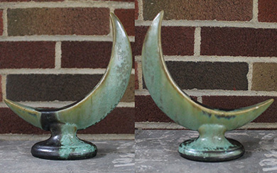 QUESTION: I collect arts and crafts pottery. At a recent auction, I bought a box lot of miscellaneous kitchenware for $8.00. A Fulper 9-inch high, crescent moon vase was among the items in the box. I assume it is a vase. There is a rectangular hole cut in the center of the interior of the moon. Attached to the back is a paper label that reads: “Panama-Pacific Exposition San Francisco 1915, Highest Award to Fulper Pottery.” The label is deteriorated and hard to read. My crescent moon vase has a 1-inch streak of dark glaze, matching the glaze on the base rim, running down the side of the vase into the pedestal and ending on the rim. The vase can be displayed so this is hidden. Is this a defect? Was this piece exhibited at the Exposition? What is its value? – BM, Kent, Ohio, Email Question