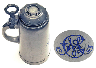 ANSWER: Algonac, Michigan, is best known as the former home of the Chris-Craft boat company. I was not able to find specific information about the company that made Electrolunch on the Internet. I recommend you call the Algonac-Clay Library [(810) 794-4471] and ask the reference librarian if any specific information exists. Your lunch box is made of aluminum and came in three colors—metallic gray, red, and yellow. It measures 12-inches by six-inches by six-inches. It was made in the late 1940s or early 1950s. An article in the June 22, 1949 edition of the Port Huron, Michigan, “Times Herald” mentions the Electrolunch box. Value for a complete Electrolunch box in working order is between $25.00 and $35.00, far too low for an object as neat as this. It is a great conversation piece. Having never given much thought about electric lunch boxes, I decided to see if similar products are available in today’s marketplace. The answer is sort of. Amazon.com offers a number of choices. HotLogic Mini Personal Oven is close but deserves no cigar. The RoadPro 12-volt Portable Stove is closer but only contains a single tray. The Luckstar Electric-Heading Lunch Box does have a three-compartment stainless steel removable tray. The cost for these items equals or exceeds the value for a secondary market working example of the Electrolunch box. The Electrolunch box stands alone in its ability to tote cold items and food needing to be reheated. An opportunity awaits some enterprising manufacturer to steal a great idea from the past. QUESTION: I purchased a chocolate set at a garage sale for an over eighty-year old relative. The set has an Oriental motif. The pot has a tapered body with a tree-like arm and spout. The sugar is covered. The sugar and creamer have a glazed pink interior. Pieces have a cobalt blue ground on which is found a green foliate border motif and a central design of a white stork standing in a pond featuring lily pads with red flowers. The pieces are not marked. My relative had a large collection of majolica pieces. Is this one of the pieces? What is my chocolate set’s value? – MF, Steubenville, OH, Letter with photographs ANSWER: Majolica has many meanings. First, Majolica is used to define earthenware (clay) that is covered by a glossy, opaque tin glaze. Manufacturers used it to imitate Italian wares. Second, it specifically describes 19th and early 20th century earthenware featuring naturalistic shapes and designs in bright colors with a glossy finish. The second does not apply in your case. The glaze on your pieces is meant to resemble a Majolica glaze but claiming it as such is a reach. It is high gloss but likely achieved using a different method. You do not own a chocolate set. The clue is the handle on the pot. Pouring spouts on chocolate sets are located near the top of a pot. You own a Japanese tea set made in the 1920s or early 1930s and meant for export to the United States. The value of the tea set is between $30.00 and $40.00. Such sets are difficult to sell. The secondary market is flooded with examples. Young people no longer have the time or inclination to use tea sets for entertaining. Their liquids of choice come in bottles. QUESTION: I have an earthenware stein that my father brought back from Germany following World War II. He was a Staff Sergeant and chef in the 10th Armored Division. The stoneware stein stands 9 1/4-inch high from the base to the top of the lid ring. The diameter at the base is about 4 1/8-inches. There are two small 1/8-inch “F” notations, one above the other on the base. There is a monogram on the front. My best guess is an intertwined script “A” and “C” across a capital “C.” Any ideas what I’ve got? – CM, Reading, PA, Email Question