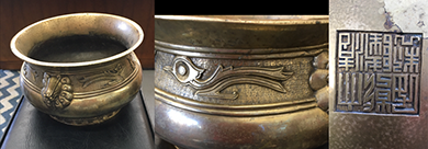 QUESTION: I recently purchased a Chinese metal, possibly pewter, vessel for $25.00. It has a wide flared rim beneath which is a collar band with an elaborate Greek key background and two relief abstract birds. The bulbous body rests on a rim foot with a swirl design. The applied heavy relief handles appear to be a lion’s face. There is a stamp on the bottom. The story behind the vessel is interesting. While at a scrap yard, I overheard a couple talking with a scrap dealer of Chinese origin about the scrap value of the vessel. The dealer’s father overheard the conversation, looked at the piece, got excited, and offered several hundred dollars. The couple refused based on the “if he is willing to pay this, someone is willing to pay more” theory. When they asked for more, the father became insulted and refused any further conversation. I took the couple’s card, called them, and offered to buy the piece. How do I view what happened, and how did I do? – KT, Madisonville, KY, Email Question