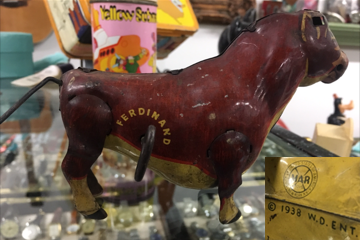 QUESTION: A friend recently gave me a lithograph tin Ferdinand the Bull windup toy. I have not had much time to look at it. The toy is between 6 and 8 inches long and between 5 and 6 inches high. The surface paint is in very good condition. The metal fit is loose. I plan to correct this. The bull has a little bee that spins and flutters on its rump. One side is marked “Ferdinand.” The base is marked with the Marx logo and “© 1938 W. D. Ent.” The horns are missing. The friend who gifted the toy said he has the missing horns and would see that I got them. This remains to be seen. What is my toy worth? – KT, Madisonville, KY, Email Question