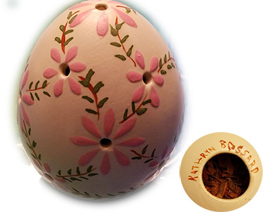 ANSWER: Brothers David and Louis Marx founded the Marx Toy Company in 1919. The company was headquartered in New York City. Their success rested on their ability to produce inexpensive copycats and knockoffs of the best-selling toys. By 1922, David and Louis were millionaires. Marx was one of the few companies that thrived during the Depression. It had three American plants: (1) Erie, Pennsylvania, its primary plant for the manufacture of lithograph tin toys; (2) Girard, Pennsylvania, devoted to Marx’s toy train lines; and, (3) Glen Dale, West Virginia, where Marx vehicles were made. Your Ferdinand the Bull toy was made in Erie. Disney’s “Ferdinand the Bull” animated short was released by RKO Radio Pictures on November 25, 1938. Disney issued two “Ferdinand” lithograph tin toy licenses to Louis Marx. The first is the stand-alone Ferdinand the Bull toy that you own. The second is the Ferdinand and Matador, a toy with matador on one two-wheeled platform and Ferdinand on a second. A bar separates the two sections. The depiction of Ferdinand on the Ferdinand and Matador toy is closer to the Disney cartoon character than the Ferdinand image of your toy The exact dimensions of your Ferdinand the Bull toy are 5 3/4-inches in length and 4-inches in height. When I first saw an image of Ferdinand’s wire tail (which rotates as part of the toy’s action), I thought what an odd way to wind a toy. I realized my mistake when I saw the key wind on the side. The toy is designed to turn in a circle, the action representing Ferdinand trying to escape the bee. The retail price for the Marx Ferdinand the Bull toy in 1940 was 25 cents. You are missing more than the horns. Ferdinand is chewing on a white or yellow flower that has a wire stem through his mouth. The period box, which has great graphics showing Ferdinand sitting beneath a tree while two calves are gamboling to his left, also is missing. In its current condition, your toy has a secondary market value between $40.00 and $50.00. FYI – I do not anticipate the newly released “Ferdinand” cartoon from Big Sky Studio/20th Century Fox to create a market bounce for 1938 Disney Ferdinand collectibles. QUESTION: I have a ceramic egg that has holes in its sides. The surface is hand painted with daisy flowers at the holes connected by leaf vines. The bottom of the egg has a hole with a stopper. The name “KATHRYN BOSSARD” is arched half way around the hole opening. I think the egg held talcum and sat on a lady’s dresser. What do you think? – CS, Reading, Pennsylvania, Email Question