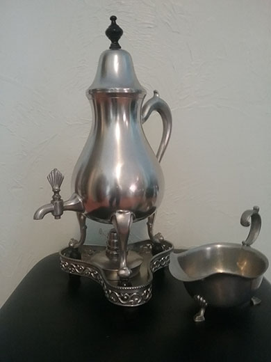 ANSWER: Your egg did not hold talcum. If powder was inserted, it would drain out the openings when the egg stood upright or on its side. Your egg is a bisque pomander. Narrowly defined, a pomander is a scent or perfume ball. As a child, I remember my mother taking cloves and sticking them, often in an elaborate geometric design, into an orange. She then hung the orange in the closet or basement to freshen the air. Using a broader definition, a pomander is a container holding a scented herb. In the case of your bisque egg pomander, it most likely held dried flower petals. In the late 19th and early 20th century, a popular glass and ceramic form was a rose bowl. It also held dried flowers and was meant to create pleasant air for its surrounds. Porcelain (china) pomanders still are being sold. I found multiple examples in the shape of an egg. Modern pomanders sell in the $8.00 to $25.00 range. The name on the bottom of your pomander indicates that it was painted by an amateur china painting school member, most likely in the first quarter of the 20th century. You did not share the story of how you acquired your egg. If locally at an auction or estate sale, chances are its painter lived in the area. Take a trip to your Public Library and see if you can find the name in an old city directory. The secondary market value for your china painting school pomander bisque egg is between $20.00 and $25.00. If you can identify the woman who painted it, add another $10.00 to $15.00 . QUESTION: I have two pewter pieces. The first is a three-footed gravy boat. It is marked “International Pewter #277 13-1.” I also have a coffee/tea/water urn with a separate base that is marked “Metawa / Holland / Pure Pewter #L1.” My kids do not want them. I do not either. What is your advice? – JT, Sheridan, WY, Email Question