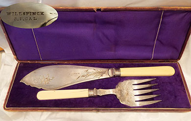 QUESTION: I would appreciate your assistance regarding my Will & Finck San Francisco dessert set. The set is in its period brown leather box. Inside is a velour-like purple material on the bottom and a silky material on the top. The case is in very good condition. The cutter/server is 12 1/2-inches long. The bone (?) handle is 4 1/2-inches long. The total length of the fork is 9 1/4-inches long, 4 inch of which is the handle. Both have lovely designs etched on them. They are clearly marked “WILL & FINCK / S.F. CAL.” The handle of the fork has a crack along part of the length. I have been online researching for hours to discover a value for my dessert set. I did find plenty of information about Will & Finck Bowie knives. I want to sell my set. – DN, Email Question