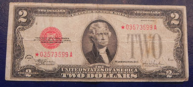 ANSWER: I love using idioms and slang phrases. Hence, I ask your forgiveness for what follows. You will be searching long after the cows come home if you continue to search under “dessert set.” You do not have a dessert set. You have a fish set. The knife and fork are used to debone fish. Although known as a manufacturer and wholesaler of knives, silver, and silver-plate, Will and Finck also sold gambling devices, some of which were used for cheating purposes. Will and Finck also imported items from New York and abroad. An internet search of “antique fish sets” will turn up several listings for sets similar to the one you own. Be prepared for sticker shock. The American secondary market is extremely weak. Secondary market retail prices range from $75.00 to $100.00. You will have trouble selling your set for anywhere near these figures. Should your travels take you to Europe in the near future, take the set with you and sell it there. Europeans love these old sets. Retail prices are more than double those in the United States. QUESTION: In going through some desk drawers, I came across a few albums used for collecting pennies. When I opened one, I found a two-dollar bill from the “Series of 1928 F.” The serial number had a red star in front of it. What does this star indicate? There are a few fold lines but no tears. Does my two-dollar bill have any value? – SS, Bozeman, MT, Email Question