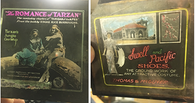 ANSWER: Proctor & Schwartz Electric Company, founded in 1920, traces its roots back to the Philadelphia Textile Machinery Company established in 1885. Proctor & Schwartz is credited with many firsts—electric glass coffeemaker, automatic iron, silent toaster, snap-apart line of serviceable kitchen appliances, and steam iron water tank. In 1960, Proctor & Schwartz Electric Company merged with the Silex Company. The merged company became Proctor-Silex Corporation. You own a Model 966 Proctor Never-Lift electric iron, an upgraded version of the Model 960. It is a thermostat iron with phenolic resin handles. The predecessor of the Model 960 was called the “Snap Stand” iron. The Model 960 went through two upgrades. Pushing on a small red button at the top front of the handle released the legs from their retracted and locked position. Wishing to resume ironing, the owner pushed down on the iron until it contacted the surface. Then using the heel of the hand, pressed the large knob at the rear of the handle. This locked the retracted legs into place. When the Never-Lift first appeared in 1940, Procter advertised heavily in leading magazines of the time such as “Life.” The cost in 1941 was $9.95. A 1948 advertisement for the Proctor Never-Lift suggests it was designed specifically for sit down ironing. The Cooper Hewitt’s Product Design and Decorative Arts Department acquired a 1940 Proctor Never Lift for its collection in 1993. The iron is an excellent example of the mid-20th century industrial design. Hence, the iron’s appeal to Modernist collectors. You were correct in your assumption that the iron has little secondary market value. eBay sellers ask between $15.00 and $25.00 for working examples. WorthPoint.com, an internet price guide using sell through prices, lists an example with its period box and instructions selling for $15.00 in November of 2017. As you indicated, your memories are priceless. This is the iron’s true value. QUESTION: I own about 20, 4-inch by 4-inch, glass lantern slides that were used in a local movie theater to advertise coming attractions, local businesses, a political Senatorial candidate, and a War Bond drive. The movie slides include “The Romance of Tarzan: The concluding chapter of ‘Tarzan of the Apes’,” “Stolen Orders,” “The Great Gamble,” and “The Unpardonable Sin.” The political slide promoted the candidacy of Richard P. Ernst for U.S. Senate. One advertising slide was for Swell & Pacific Shoes: “THE GROUND WORK OF / ANY ATTRACTIVE COSTUME.” Do these slides have value? – KT, Madisonville, KY, Email Question
