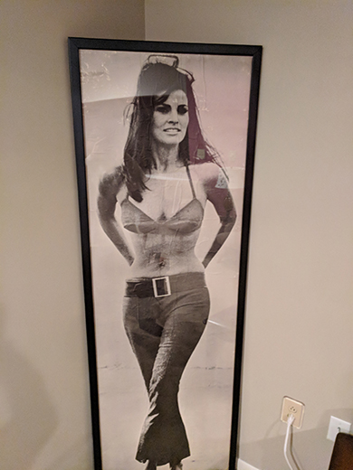 ANSWER: Whether they have any financial value is irrelevant. They have a great backstory. The fact that they are empty probably meant that the sake was good as well. I always am skeptical about “pass it down the generation” stories. My research attempt to determine how sake was sold in Japan in the immediate post-1945 period was only partially successful. I found evidence that there were sake stores, albeit most were associated with a specific manufacturer. Most sake was sold in paper labeled bottles. A Google search of “vintage late 1940s hand painted sake bottles” resulted in more than a dozen images. Most bottles had a tall, tapered conical body. I did not find any bulbous body bottles. Not finding evidence for something does not mean it did or does not exist. I am certain your sake bottles are period. I just am not looking in the right place. The pictures of late 1940s ceramic sake bottles I found were more elaborately decorated than the examples you own. Your uncle’s story for the limited decoration seems plausible. The secondary market value for your two bottles is between $15.00 and $20.00 each. REQUEST FOR HELP – Did any readers who served in the US military or lived in Japan in the late 1940s or 1950s have s similar experience? If yes, email your recollections to harrylrinker@aol.com QUESTION: I have a life-size picture of Raquel Welch. I found it rolled up in a tube in the attic of a house that I bought. I paid $350.00 to have it framed because I loved it so much. How much is it worth? – VM, Email Question