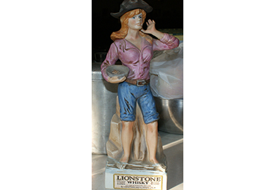 ANSWER: Your silver ingot $100.00 bill replica was produced by the Washington Mint. It weighs four ounces. Washington Mint is not the same as the U.S. Mint in Washington, D.C. In 2000, the United States of America filed suit against the Washington Mint, LLC., Suvon Limited Partnership, Movus Marketing, Inc, Thomas Brokl, Henry Cousineau, Scott Jagodzinski, and Damien Topouise for “copyright infringement, trademark infringement, and false advertising” for its gold coin replica of the Sacagawea dollar. The court ruled that while the names are very similar and could be confused, circumstances were such that refusing to allow the Washington Mint to continue to use its name would cause an undue financial loss for the company. Mints, such as Washington Mint, sell fine silver commemorative ingots impressed with the faces of personalities, historical events, and other images suggesting but not actually guaranteeing that these objects will increase in value over time. The cost for these commemorative pieces, often sold as sets and attractively packaged in books and boxes, is two times or more of spot/melt value of the silver found in each ingot. In reality, the only way these pieces can increase in value is if the melt value of silver rises significantly from the value of the ingots when minted. At the moment, the spot or melt market for silver is depressed. As of July 18, 2018, the spot value was $15.85 per ounce, meaning the maximum melt value of your ingot was $63.00. I checked WorthPoint.com’s 2018 listing for sales of your Washington Mint $100.00 bill. The bill initially came in a box with a certificate of authenticity. The box and certificate need to be present to achieve maximum resale value. Sell through prices for the complete unit ranged from $55.00 to slightly over $100.00. The majority sold below $75.00. By the time you pay commission to an internet seller or auctioneer, you will receive less than the spot/melt value. My suggestion is to wait until the spot/melt rises above $30.00 an ounce. It has happened before and will likely happen again. When it does, sell your ingot for spot/melt value. One final note: The secondary market is flooded with Washington Mint fine silver material. Scarcity will never be an issue. QUESTION: I have a figural whiskey bottle of a woman holding a pan of gold in her left hand and putting her cupped right hand by her mouth as though she is shouting. She has red hair and is wearing a rose-colored shirt and blue jeans rolled up to her knees. The label reads: “LIONSTONE / WHISKEY / Kentucky Straight Bourbon / Bottled in Bardstown, KY / By LIONSTONE DISTILLERS, Ltd.” What is the history and value of my bottle? If I sell it, what should I ask? – H., West Chester, PA, Email Question