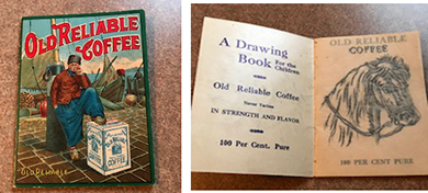 QUESTION: I collect paper items. Recently, my father and I attended an auction where we bought a 1922 Pennsylvania paper fishing license, 1923, 1924, 1926, and 1927 Pennsylvania fishing pins, a 1924 Pennsylvania hunting license, and two peanut butter glasses. The total for all my purchases was $515.00. My question concerns something I did not buy. During the preview, I noticed a postcard lot that included an Old Reliable Coffee child’s drawing book advertising premium. I had no interest in the postcards but wished to buy the Old Reliable Coffee advertising premium. When the lot came up for sale, the auctioneer held up three of the postcards. Fearful that the Old Reliable Coffee advertising premium was no longer part of the lot, I did not bid. The lot sold for $15.00. The person who purchased the lot sat in front of me. Watching her review the lot, I noticed the Old Reliable Coffee advertising premium. I asked her if she was willing to sell it to me. She was. I bought it for $20.00. My question concerns the auctioneer. Was he unethical to the buyer and seller by not showing the full lot at the time of the bidding? – LH, State College, PA, Email Question