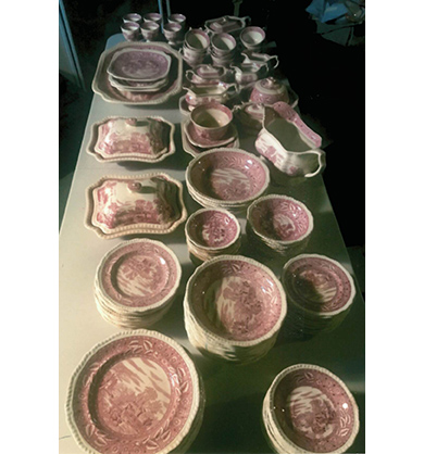 QUESTION: About 40 years ago, my mother bought a large collection of Salem’s Heirloom, red transfer dinnerware. She was told at the time it was about 50 years old. The dinnerware service consists of 131 pieces. I can set a service for twelve (dinner plate, cup and saucer, salad bowl, desert plate, and fruit bowl plus a luncheon plate). There are four open serving bowls, two covered serving bowls, a soup tureen, one large and two smaller serving platters, butter dish, gravy with underplate, large pitcher, teapot, and more. I would like to learn more about the pattern and its worth. I would consider selling it if someone is interested. –KD, Dellroy, OH, Letter