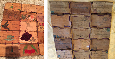 ANSWER: Leather postcards date from 1903. They were novelty postcards sold to tourists. The cards were made from deer hide with the reverse images burned into the postcard using a technique known as pyrography. The United States Postal Service banned leather postcards in 1907 because they jammed the postal canceling machines. Nonetheless, they remained in production as souvenirs until 1910. Postal collectors continued to exchange them because of their novelty. Comical pictures were very common. One of the postcards in your item features the cartoon character Happy Hooligan sitting on a box. The caption reads “ARE YOU HAPPY.” When breaking apart a postcard album dating from the first decade of the 20th century, finding one or more leather postcards is common. Some images such as flowers and holiday cards were extremely common. A few featured animal and landscapes. Since they were sold as souvenirs, it is common to find the location or site printed on the card. One of the images on your item shows an older gentleman standing in front of a wash pitcher and bowl on a stand and looking out the window. The caption reads: “I’m Homesick.” The value of a leather postcard depends on its condition and image. Since these cards are sewn together and have holes punched in the corners, their condition would not be acceptable to most individual postcard collectors. Your item as a whole is the exception. It was common practice to stich leather postcards together to create a pillow cover or wall hanging. You have a pillow cover. A more detailed history of leather postcards is available on “Auction Finds” (https://myauctionfinds.com/2016/08/08/short-lived-frenzy-over-leather-postcards/). When I checked Worthpoint.com on Sunday, May 5, the site contained 98,980 listings for leather post cards. A check by sale date suggest an average sell through price is between one and two dollars. Leather postcards with special themes, for example, extremely humorous or political images, bring more. Leather postcard pillow covers sell through between $20.00 and $35.00. Again, a special theme such as all Valentine cards results in a higher price.