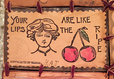 QUESTION: I am in California. While going through some family memorabilia, I found an unusual item. It consists of five rows of three leather postcards held together by a leather tie. The cards are addressed to a family member who lived in Lookout, California. One still has the stamp. Most are postmarked. The back of the cards are printed with comic, floral, and seasonal scenes and signed by the senders. Can you tell me the use of this unusual item and if it has any value? – DB, Shillington, PA, Email Question