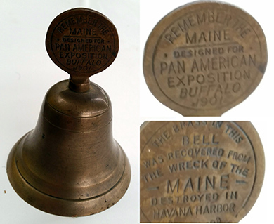 ANSWER: The Rose Bowl played on January 1, 1940, was the 26th Rose Bowl game. The USC Trojans (7-0-2) played the University of Tennessee Volunteers (10-0). Tennessee turned down an invitation to play in the Sugar Bowl in order to play in the Rose Bowl. The final score was USC 14 and Tennessee 0. When the Rose Bowl Player of the Game award was created in 1953, a committee was assigned to apply the designation to earlier games. Ambrose “Ramblin’ Amby” Schnidler, the USC quarterback, was named the 1940 Rose Bowl Player of the Game. There is an active secondary market for tickets and ticket stubs to major sporting events and concerts, especially the legendary rock concerts of the 1960s and 1970s. Ticket stubs are more common than full tickets. It is surprising how many tickets and stubs survive from sporting events. A “sale date” search on WorthPoint.com suggests between five and ten 1940 Rose Bowl tickets or stubs appear at auction annually. Stubs sell between $18.00 and $25.00. Full tickets are in the $40.00 to $50.00 range. Grading, especially a high grade, appears to double the price for tickets and stubs. Of course, there is always an unexplained anomaly. On January 20, 2017, an example of a complete 1940 Rose Bowl ticket sold on eBay for $208.50. A check of the listing explained the anomaly. The ticket was sold as part of the estate of Steve Sobal who was associated with NFL films. The value added by provenance is tricky. In this case, it turned out to be a plus. QUESTION: I own a small brass bell with a round disk attached to the top. The obverse reads: “REMEMBER THE” in an arch over “MAINE” above a line beneath which is “DESIGNED FOR / PAN AMERICAN / EXPOSITION / BUFFALO.” The reverse reads “THE BRASS IN THIS / BELL /WAS RECOVERED FROM / THE WRECK OF THE / MAINE / DESTROYED IN HAVANA HARBOR / FEB. 15, 1898.” What is the value of this souvenir bell? – Morgantown, PA, Appraisal Clinic Find