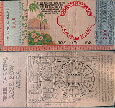 ANSWER: Printing can be done on any reasonably flat surface. Canvas, cardboard, paper (glossy or flat surface, plain or textured), textile fabrics (cotton, linen, synthetics, and more), tin, and wood are a few surface examples. Color printing on canvas to create the impression of a painting on a textured surface was well established by the nineteenth century. After studying the images that you sent, I do not recommend reattaching the canvas to a stretcher. The turned down edges are too fragile. Instead, place the canvas on a piece of acid free mat board and cut an acidic free matt or double matt that will hide the unattractive edges and make the image the central focus. Any money spent matting and framing the piece will exceed the value of the Madonna and baby Jesus printed canvas. Religious pictures such as this, even if they are over 75 years old, have minimal collector value. The value of the piece is its sentimentality to the owner and not monetary. As to touching up the printed image on the canvas, the decision is a tricky one. My advice is to frame and matt the piece and then examine it at arm’s length. If the damage does not stand out, leave it alone. Eyes are easily fooled to see what they want to see and not what they actually see. Chances are the eyes will fill in the damaged areas and make the image appear whole. If the damage is noticeable, then do restoration work. The rule is not to do something that cannot be easily removed should the owner wish to take a “more expensive” approach. When finished, the image will have enhanced value based on the quality of the matting and framing. A realistic secondary market value is between $45.00 and $60.00. QUESTION: My father-in-law’s brother purchased a ticket to the 1940 Rose Bowl between UCLA and the University of Tennessee. He was a member of the Marine Corps and stationed in California. When the ship left sooner than expect, he was unable to use the ticket. Unfortunately, he was killed in combat on Iwo Jima. My father-in-law ended up with the ticket which he now has given me. Does it have any value? – BB, Grandy, NC, Email Question