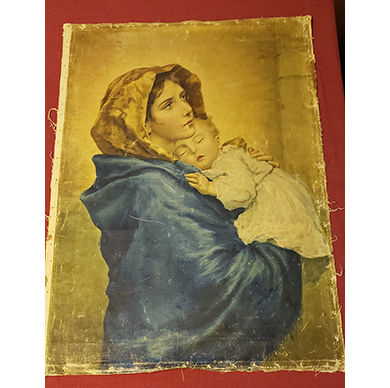 QUESTION: A client brought me an image of the Madonna holding the baby Jesus on canvas and asked me to restore and frame it. The image measures 19.25 inches by 27 inches. The canvas size is approximately 20 inches by 28 inches. The image appears to be printed on the canvas. There is no apparent paint thickness nor brush marks. Over time, parts of the ink have worn off. There also are scrape marks on the surface. The client, who was born in the 1950s, remembers seeing the Madonna and child image hanging on the wall of his parent’s home in Columbia. He removed it from the period stretcher to transport it to the United States. There is no date or signature on the image. There are two handwritten notations on the back – ‘Para Mercedes” (for Mercedes) and a name I cannot read. I have researched the image and cannot find out anything about it. What are your thoughts? – L, Duck, NC, Email Question