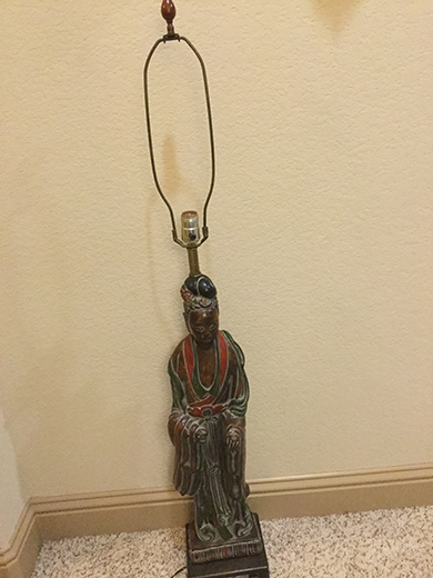 QUESTION: I met your wife Linda and you during on our 2017 Alaskan Cruise/motor coach/rail trip. During the train ride from Denali to Anchorage, we talked about your book “Sell, Keep, or Toss” and my eventually having to deal with my mother’s things when she died. My mother passed away a few month ago. I would like your opinion about the value and disposal options for a Fredrick Cooper lamp with a carved Asian figure lamp standard that belonged to her. – TB, McKinney, TX, Email Question