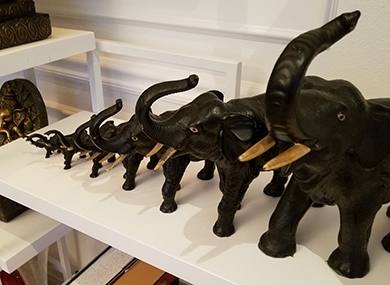 ANSWER: Frederick Cooper, a Chicago artist, established his studio in 1923. He began his career as a sculptor and watercolorist. In the 1920s, Chicago was experiencing an architectural renaissance. Cooper became fascinated with lamps, especially those that combined a range of materials such as brass, glass, fabric, and wood. The Frederick Cooper Lamp Company, located in Rocky Mount, North Carolina, is still in business. The company has a showroom in High Point, North Carolina, now the American furniture capital. Today’s lamps contain a combination of alabaster, art glazed ceramic, brass, bronze, copper, crystal, jade, marble, nickel, painted porcelain, and wood. The website www.chelseahouseinc.com notes in its section about Frederick Cooper that: “We carefully select a luxurious fabric to shade each lamp base. Our signature Frederick Cooper shades are peerless in execution… The picture of the lamp that accompanied your email shows it without its shade. If you do not have the period shade, approximately half the resale value of the lamp is gone. Have you priced the cost of middle to high-end shades? When a potential buyer looks at your lamp, he/she is going to subtract the cost of the shade from the price he/she is willing to pay. You need to do web research to answer two questions. Is your mother’s lamp still in production? While I suspect it is not, double check. Study the prices of new Frederick Cooper lamps. Cut the value in half to determine the price of the standard without the shade. Once you have an average cost, reduce it by 50 percent. This is the most you will be able to realize from the sale of your lamp. In reality, you will get even less. A WorthPoint.com “Frederick Cooper lamp” search resulted in my finding an exact match for your lamp. It sold for $100.00 on December 6, 2016 as reported by eBay. Since this lamp had its shade, a realistic sell through price for your lamp without its shade is between $40.00 and $50.00. In order to sell your lamp quickly, you will need to undercut current asking prices. Hence, your lamp’s secondary market quick resale value is between $25.00 and $30.00. The good news is that McKinney is in the Dallas-Fort Worth metropolitan area. Asian theme pieces are favorites of interior decorators seeking accent pieces. The negatives are: (1) your lamp has no collector value (no collector is seeking to own 100 examples of Frederick Cooper lamps); (2) it is a standalone lamp (pairs sell better); and (3) the period shade is missing. Craigslist offers the best sales option. List it at “best offer above $35” and keep your fingers crossed. QUESTION: Could you tell me what my political pin might be worth? It is a brass button with Franklin D. Roosevelt and John N. Garner on it. It says “Medallic Art Co. / New York City / New York.” It says “A New Day, A New Deal.” -- LR, Hickory, PA, Mail Question ANSWER: Because your description was somewhat confusing, it took me longer than I expected before I found the answer. This is why I encourage readers to send or email photographic images along with their questions and/or provide detailed descriptions that explain what is on the front and then the back or describe an object from top to bottom or side to side. You have a political button or more correctly a political pinback. The pinback you own was used during the 1932 Presidential campaign pitting Franklin D. Roosevelt, the Democratic candidate, against Herbert Hoover, the Republication candidate. Your pinback button is made of brass. It is known as a jugate because it pictures both the presidential and vice-presidential candidates. It is 1 15/16 inches in diameter. The pin features a relief image of the two faces. Garner’s partial left facial profile is behind Roosevelt’s full left face profile. The banner beneath the faces reads: “FRANKLIN D. ROOSEVELT / JOHN N. GARNER. “A NEW DAY” is along the left border and “A NEW DEAL” on the top. The Medallic Art Company of New York did make the pin. Its MACO stamp is on the reverse side. The two primary campaign slogans during the 1932 campaign were “Happy Days Are Here Again” for the Democrats and “We Are Turning The Corner” for the Republicans. An attempt to find other 1932 Democratic campaign material with the slogan of “A New Day, A New Deal” was unsuccessful. A check of WorthPoint.com produced several 2018 sell through listings for your political pinback. The high price was $24.95. The lowest was $10.00. A reasonable secondary market value for an example in very good or better condition is between $17.00 and $19.00. An example did sell through in 2006 for $41.02. 2006 is a long way away from 2019. The Great Recession and the passing of time impacted many segments of the antiques and collectibles market. Political pinbacks were not immune. Given your Roosevelt/Garner pinback’s value, it will be a difficult sell. My advice is to take any offer above $10.00. The best method is to take it to a local flea market, find a seller who specializes in political material, and offer it to him/her. QUESTION: I own a graduated set of seven wooden elephants. My thinking is that they date back to shortly after World War II. Do they have any value? – DD, Houstin, TX, Email Question